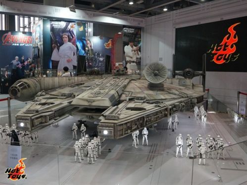 星战迷们热烈期待的年度巨献《星球大战:原力觉醒》将于12月18日全球上映。Hot Toys 特别制作了巨型1:6比例星战千年隼号,在广州漫展内地首秀。机体全长约18尺、宽12尺、高4尺,重约1吨。搭配超过50名暴风兵严阵以待,配合太空星际背景,将电影场景完美还原。现场展示的还有1:6 比例千年隼号机舱,机舱内整体布局细致精巧,发光的电子控制台极度逼真,呈现汉索罗及楚巴卡驾驶太空船的经典场景。以《星球大战》绝地大师欧比旺于千年隼号主舱训练天行者卢克的1:6比例场景,也是全国首次曝光。现场展示的还有众多星战珍藏人偶,其中就包括《星球大战:原力觉醒》神秘反派凯洛·伦及全新暴风兵珍藏人偶系列,《星球大战》莱娅公主及天行者卢克等。观看星战展览的观众众多,异常火爆。