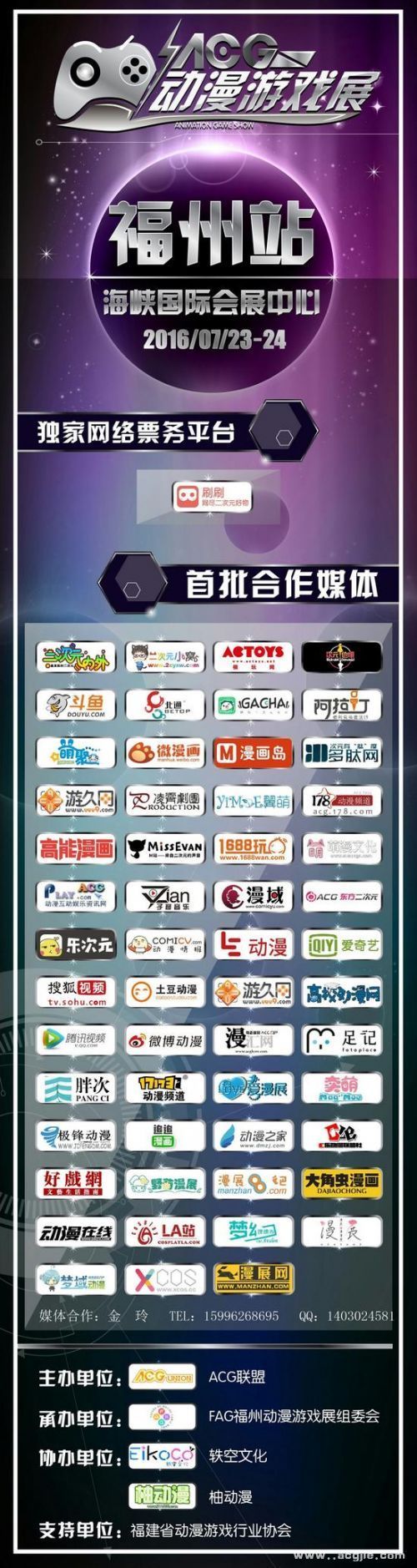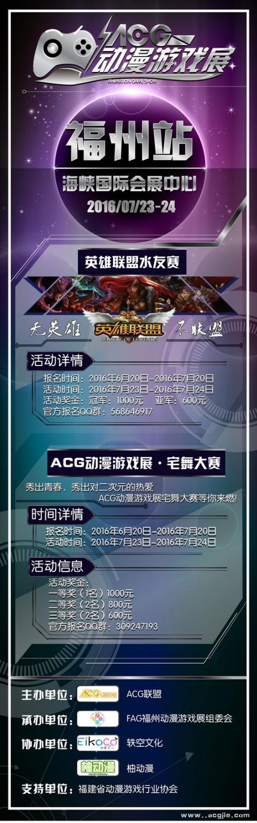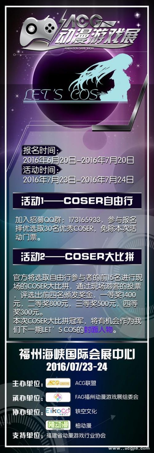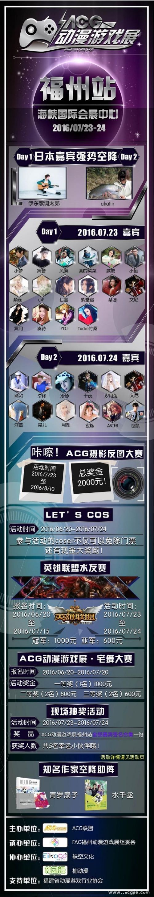 由ACG联盟主办,FAG福州动漫游戏展组委会携手轶空文化、柚动漫倾情奉献,ACG动漫游 戏展,将于7月23-24日在福州海峡国际会展中心与广大动漫游戏爱好者私会两日,郎妾咸聚。当然在展会现场我们依然邀请了深受大家喜爱的二次元嘉宾与大 家深入搞基~还不赶叫上你的小伙伴约过来!