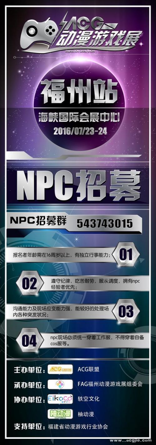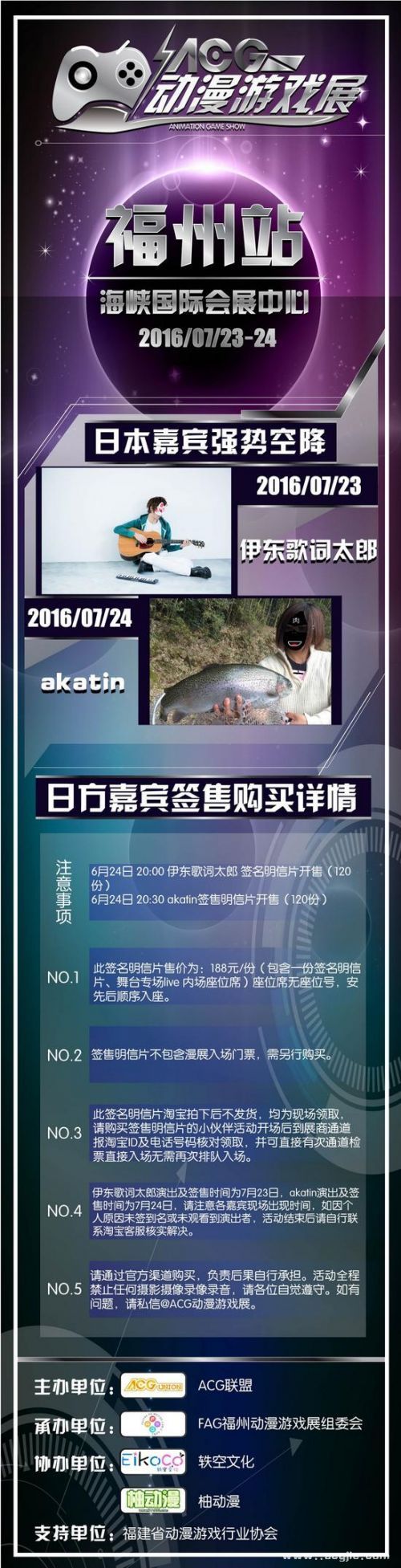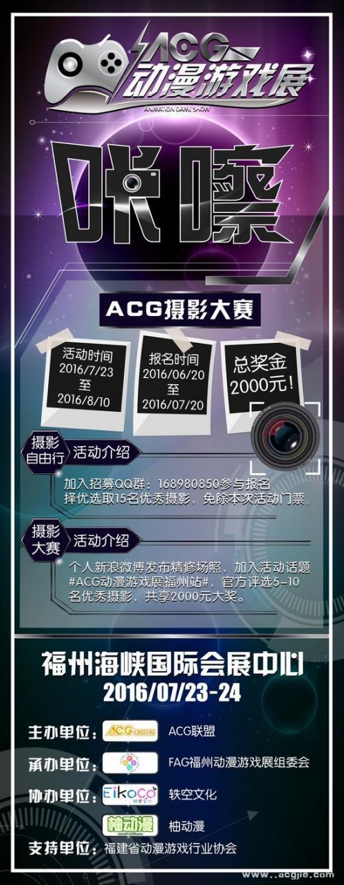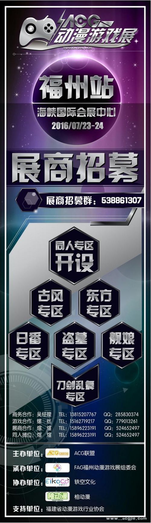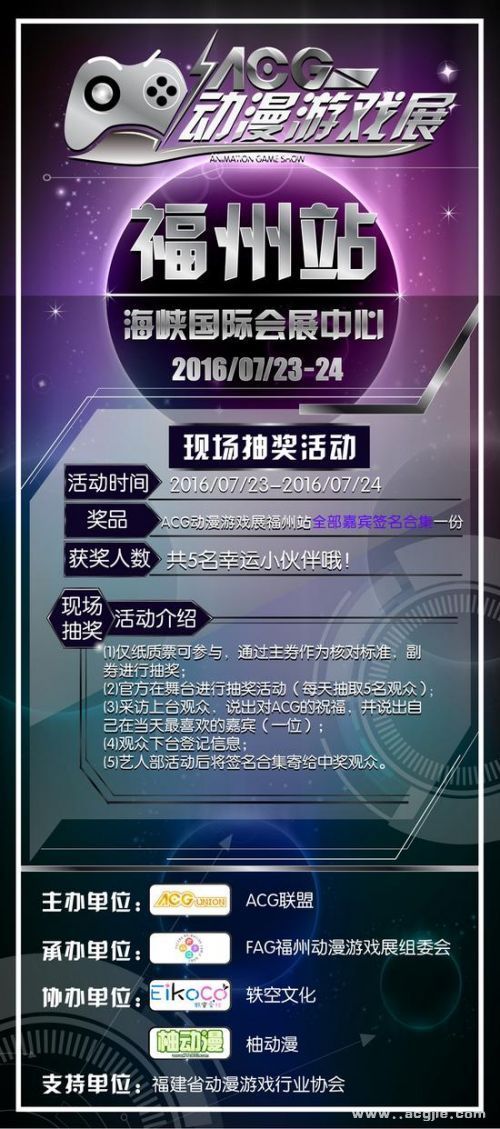 由ACG联盟主办,FAG福州动漫游戏展组委会携手轶空文化、柚动漫倾情奉献,ACG动漫游 戏展,将于7月23-24日在福州海峡国际会展中心与广大动漫游戏爱好者私会两日,郎妾咸聚。当然在展会现场我们依然邀请了深受大家喜爱的二次元嘉宾与大 家深入搞基~还不赶叫上你的小伙伴约过来!